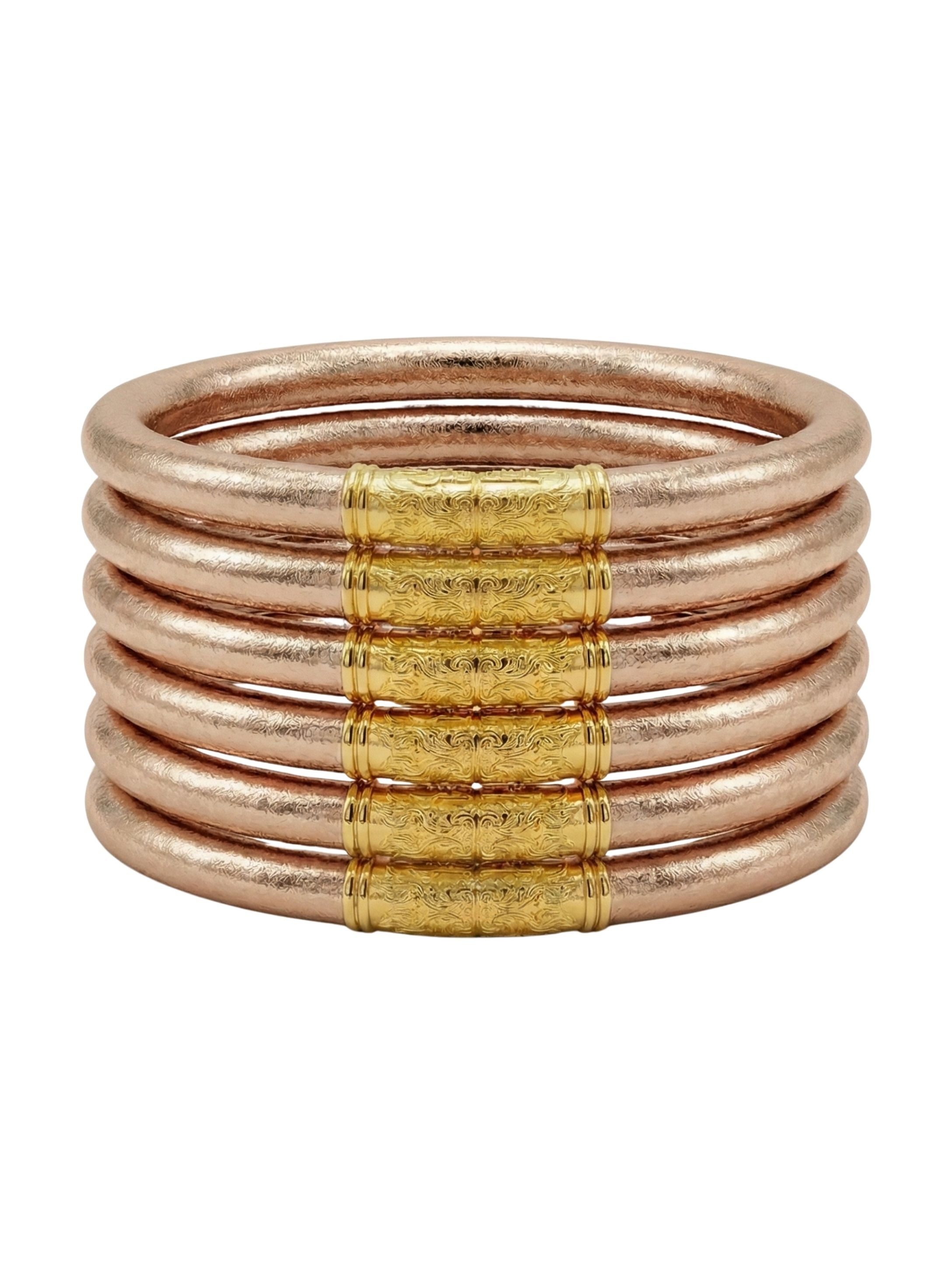 Handcrafted in Thailand, each bangle carries the engraved mantra Ananta Śānti to honor its origin of presence and calm. The smooth finish and polished gold-toned clasp add a subtle point of shine. Designed to complement any stack or stand beautifully on their own, they transition effortlessly from everyday wear to more refined moments.