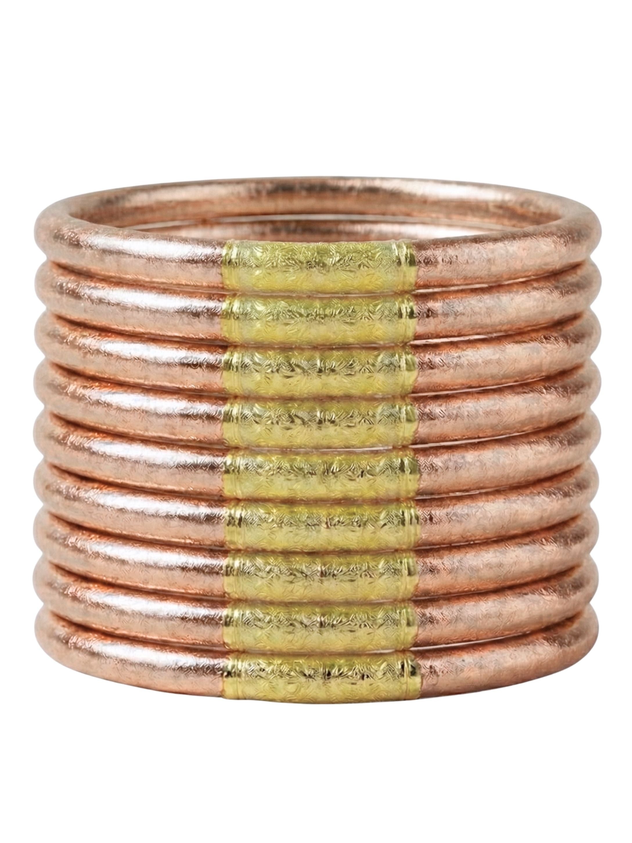 Handcrafted in Thailand, each bangle carries the engraved mantra Ananta Śānti to honor its origin of presence and calm. The smooth finish and polished gold-toned clasp add a subtle point of shine. Designed to complement any stack or stand beautifully on their own, they transition effortlessly from everyday wear to more refined moments.