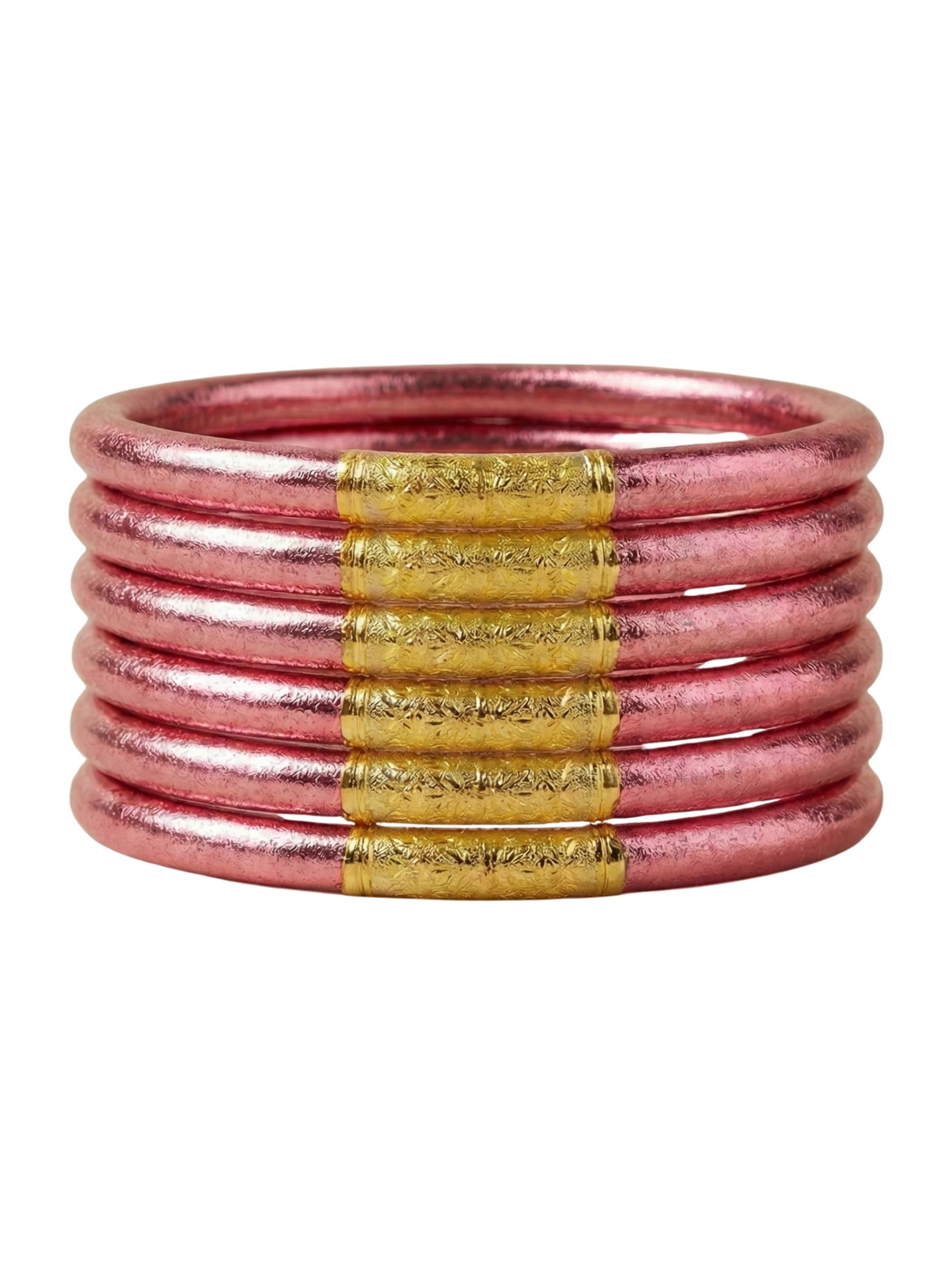 Handcrafted in Thailand, each bangle carries the engraved mantra Ananta Śānti to honor its origin of presence and calm. The smooth finish and polished gold-toned clasp add a subtle point of shine. Designed to complement any stack or stand beautifully on their own, they transition effortlessly from everyday wear to more refined moments.