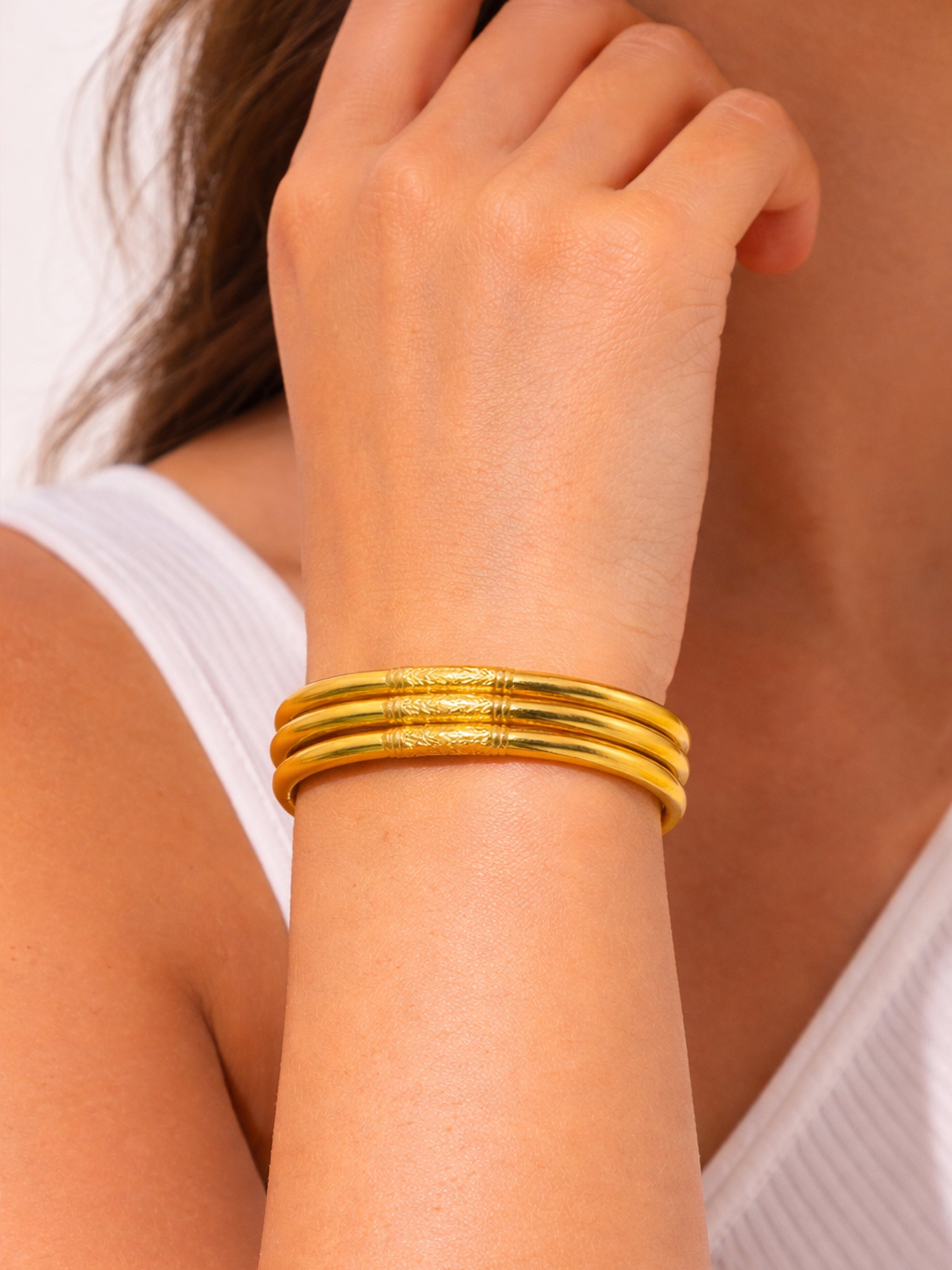 Tip: A well-fitted bangle should slide over your knuckles with a gentle push and feel secure but not tight on your wrist.