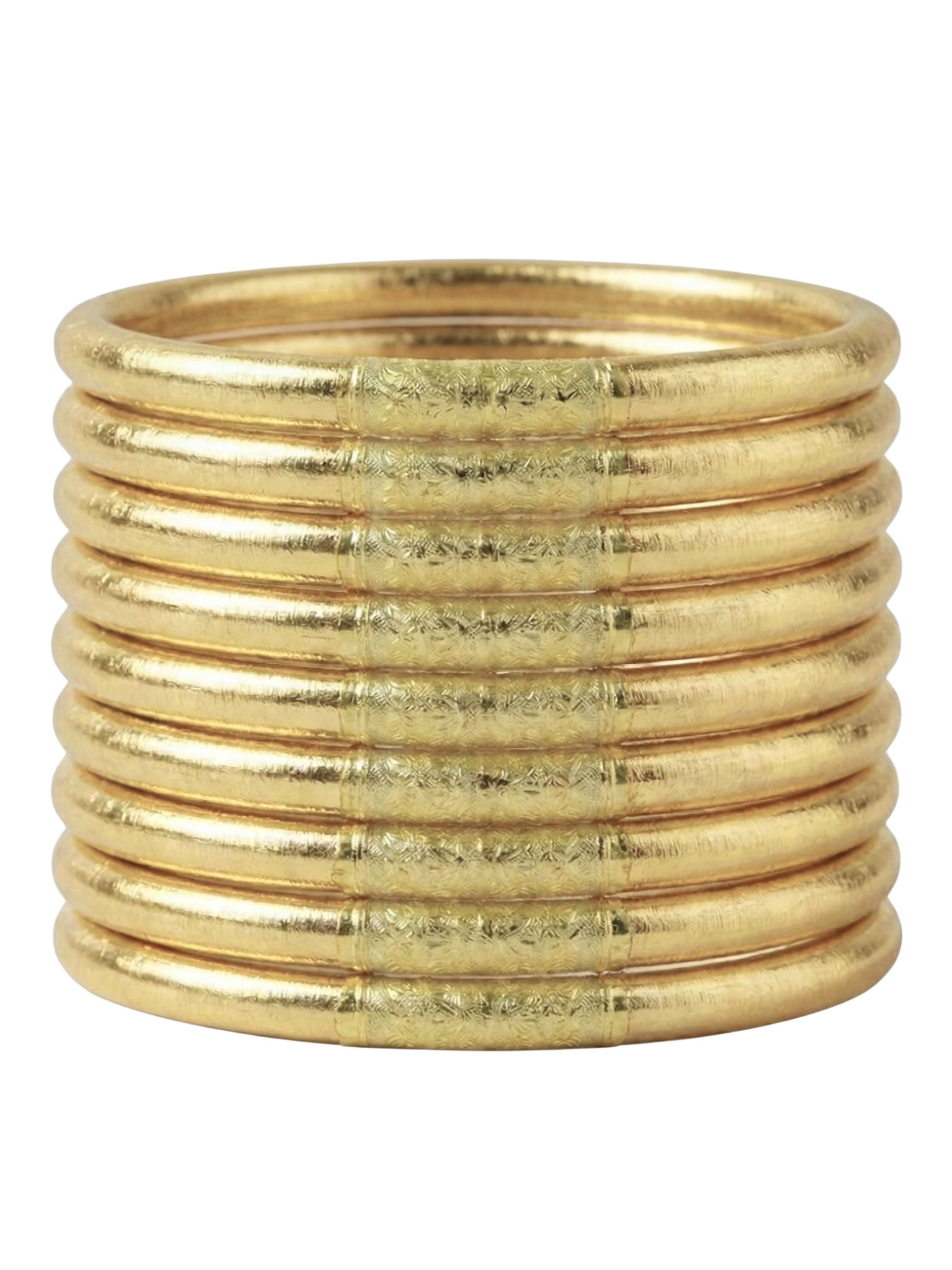 Handcrafted in Thailand, each bangle carries the engraved mantra Ananta Śānti to honor its origin of presence and calm. The smooth finish and polished gold-toned clasp add a subtle point of shine. Designed to complement any stack or stand beautifully on their own, they transition effortlessly from everyday wear to more refined moments.